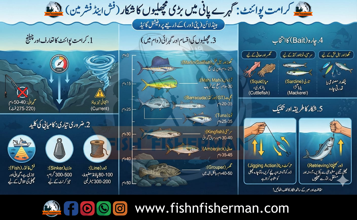 دوستو آپ میں سے تقریبا ہر کسی نے کرامت کا نام ضرور سنا ہوگا اور کافی دوست وہاں گئے بھی ہوں گے جو لوگ گئے ہوں گے وہ جانتے ہیں کہ وہاں کی گہرائی چالیس سے پچاس وام تک ہوتی ہے لہذا وہاں عام پوائنٹس والی فشنگ یعنی باٹم کھیلنا قدرے مشکل کام ہے۔ ہم نے مچھلیوں کے طرز و رہائش اور شکار کے طور طریقوں پر انٹرنیٹ سے دستیاب معلومات کی بنیاد پر کچھ مواد اکٹھا کیا ہے یہ مواد آپ کو باٹم کے علاؤہ بھی شکار کھیلنے پر مدد دے گا۔